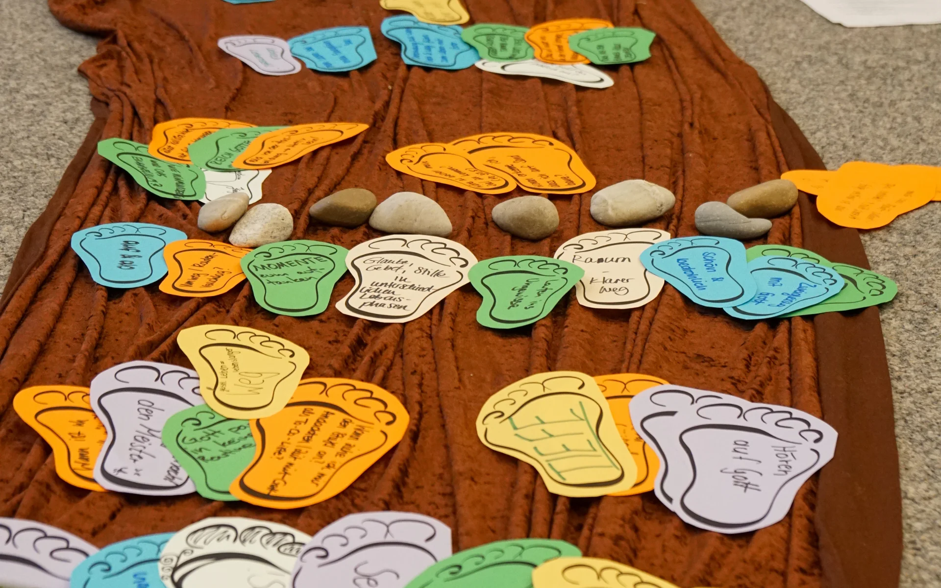 Am Ende dieser Woche lag unser Weg als Bodenbild aus vielen Fußstapfen von Schritten, die wir diese Woche gegangen sind – als Gemeinschaft und auch als Einzelne. Damit sich das alles entfaltet, braucht es Zeit! Aber angefangen mit der Umsetzung haben wir bereits. Es bleibt spannend!